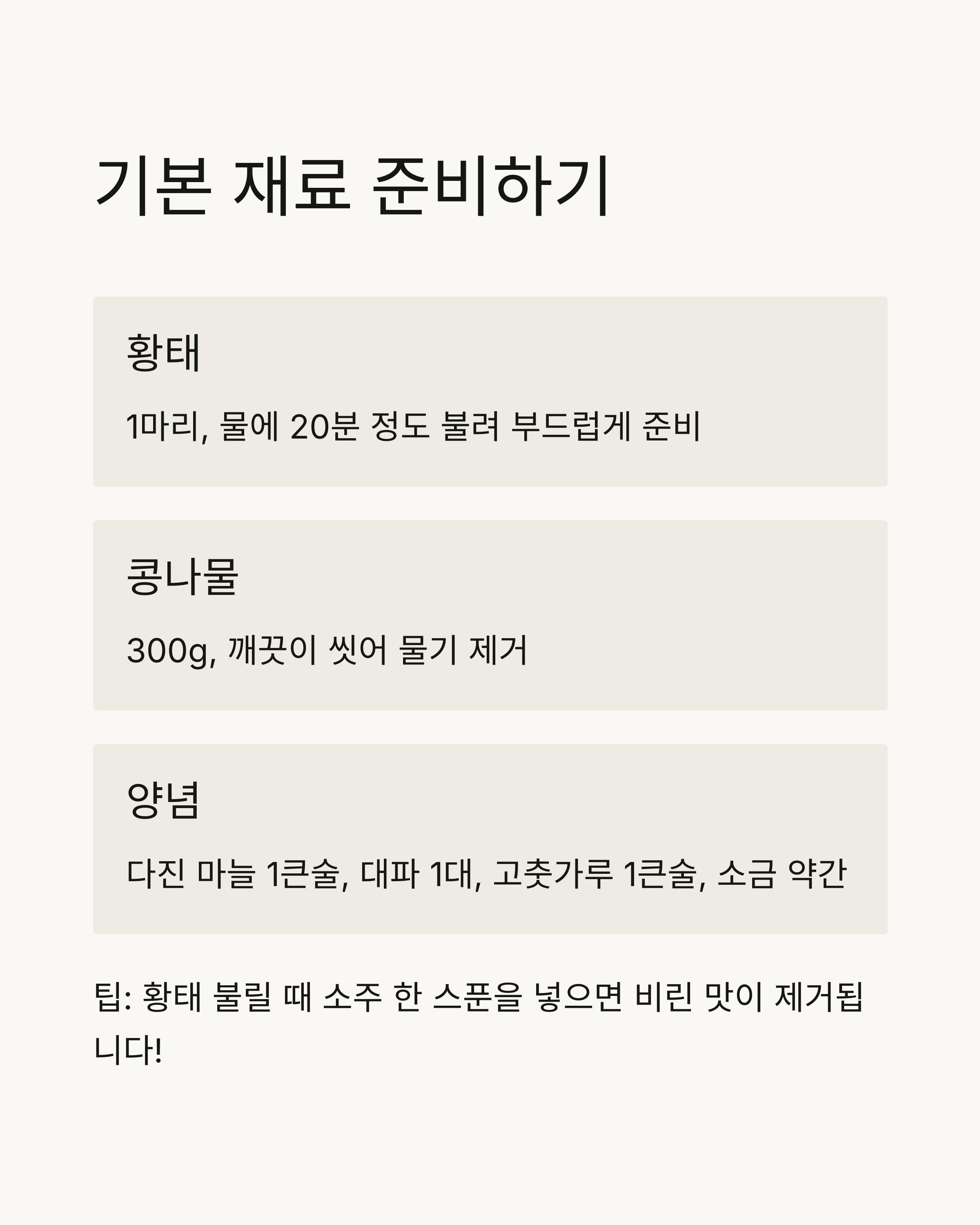 팁: 황태를 불릴 때, 물에 소주 한 스푼을 넣으면 비린 맛을 제거할 수 있습니다.