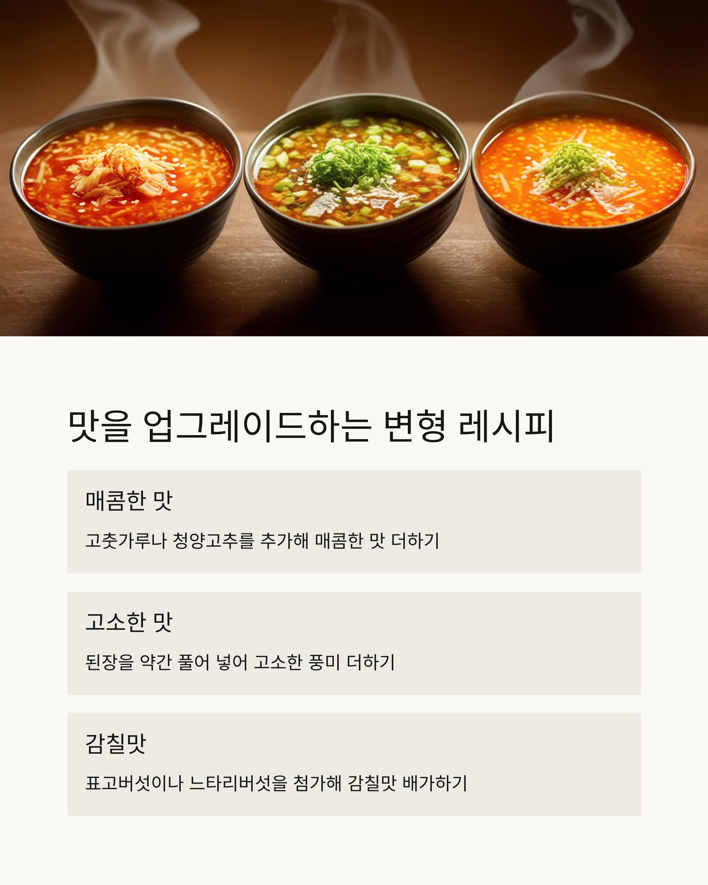 - 버섯 추가: 표고버섯이나 느타리버섯을 첨가하면 감칠맛이 배가됩니다. 버섯은 국물에 자연스러운 단맛과 향을 더해주어, 더욱 풍성한 맛을 느끼게 합니다.
