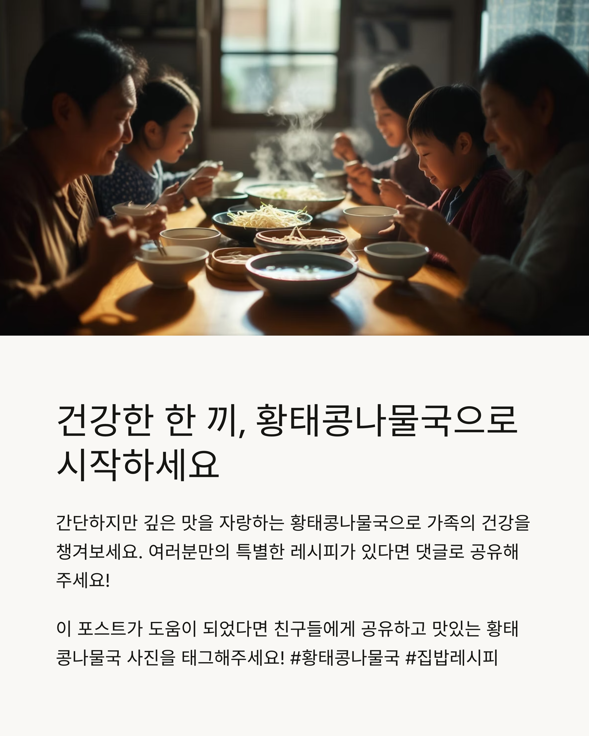 이렇게 준비한 황태콩나물국은 가족 모두가 함께 즐길 수 있는 건강한 한 끼로 손색이 없습니다. 여러분의 황태콩나물국은 어떤 특별함을 더할 예정인가요? 🍜