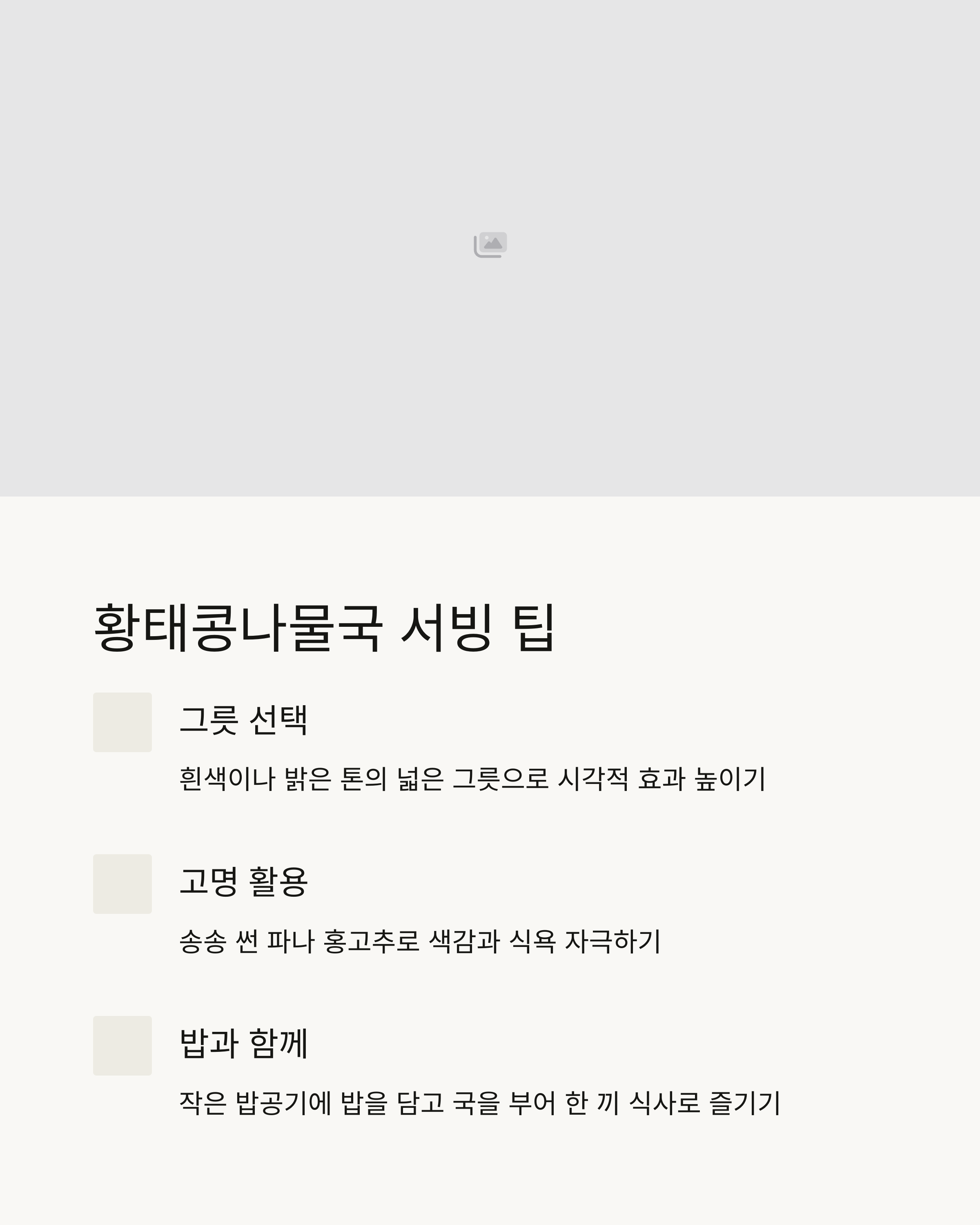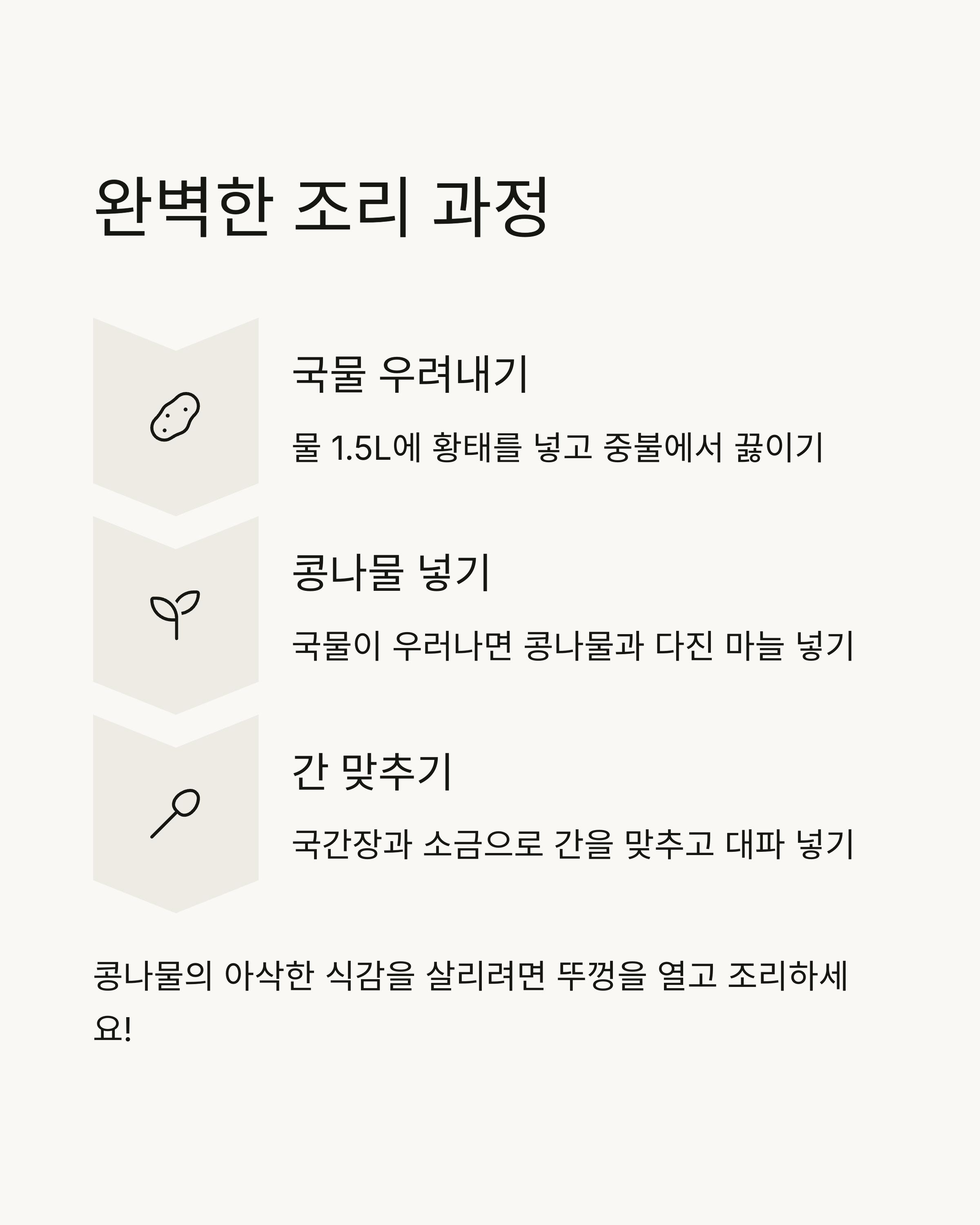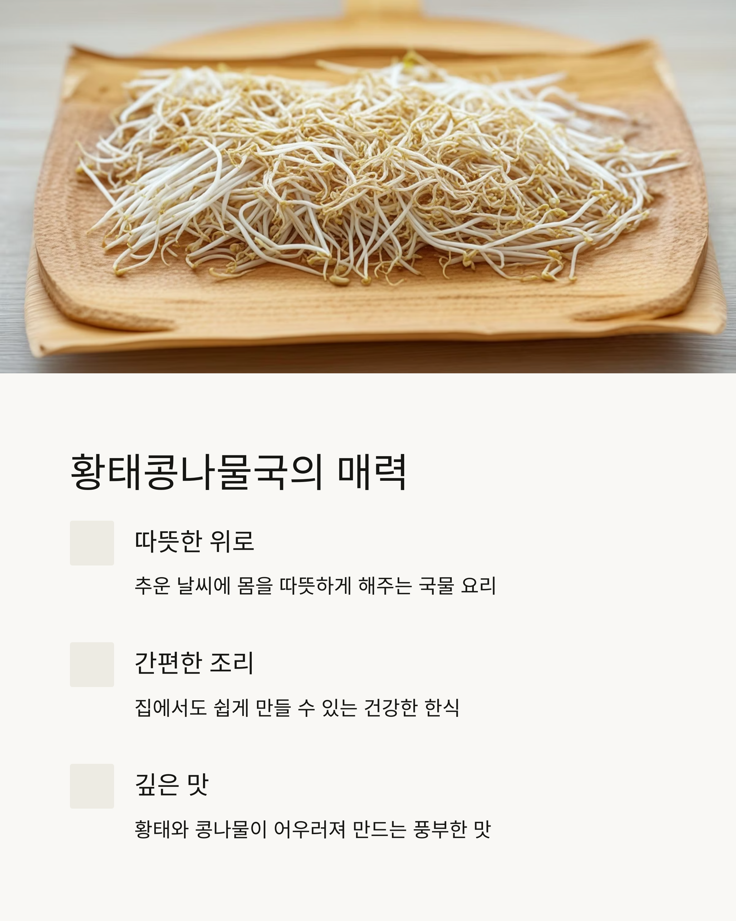 "황태콩나물국은 언제나 우리의 몸과 마음을 따뜻하게 해줍니다. 그 맛과 향을 가장 잘 즐기기 위해서는 서빙에도 신경을 써보세요."