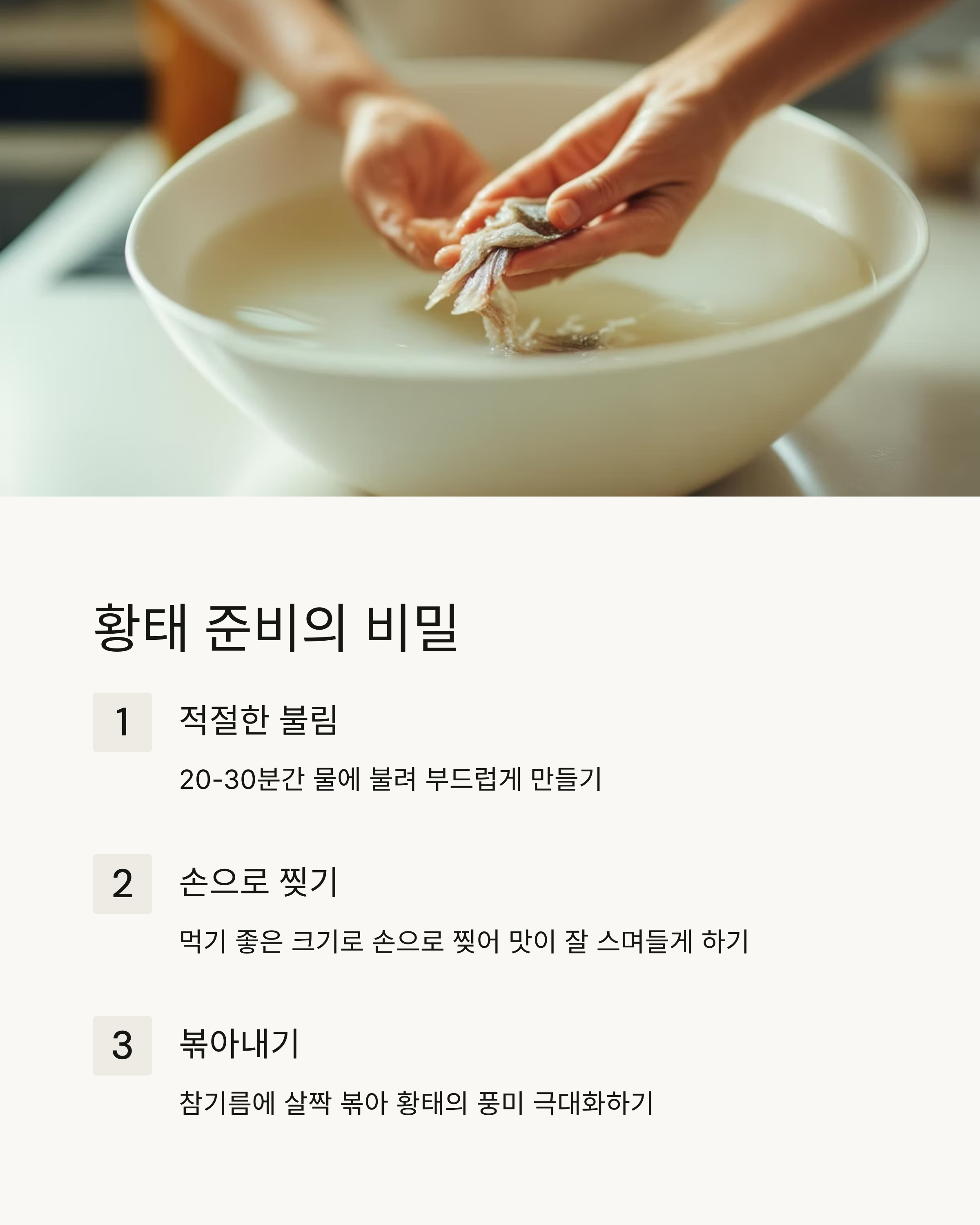 팁: 황태를 불릴 때 너무 오래 두지 않도록 주의하세요. 너무 오래 불리면 황태의 식감이 떨어질 수 있습니다.